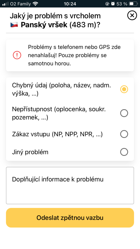 Du kan absolutt hjelpe oss ved å minne oss på denne toppen (toppkoordinater) ved å sende en e-post til info@horobrani.cz. Bekreftelseskilden for oss er alltid de nasjonale geoportalene, for Tsjekkia er det bare Geoportal of the ČÚZK, som du finner i applikasjonen med navnet Base Map. Bytt til dette laget, og deretter kan du bekrefte om toppen oppfyller kravene ovenfor. Du kan finne koordinatene ved å holde fingeren i kartet. På forhånd takk for hjelpen.